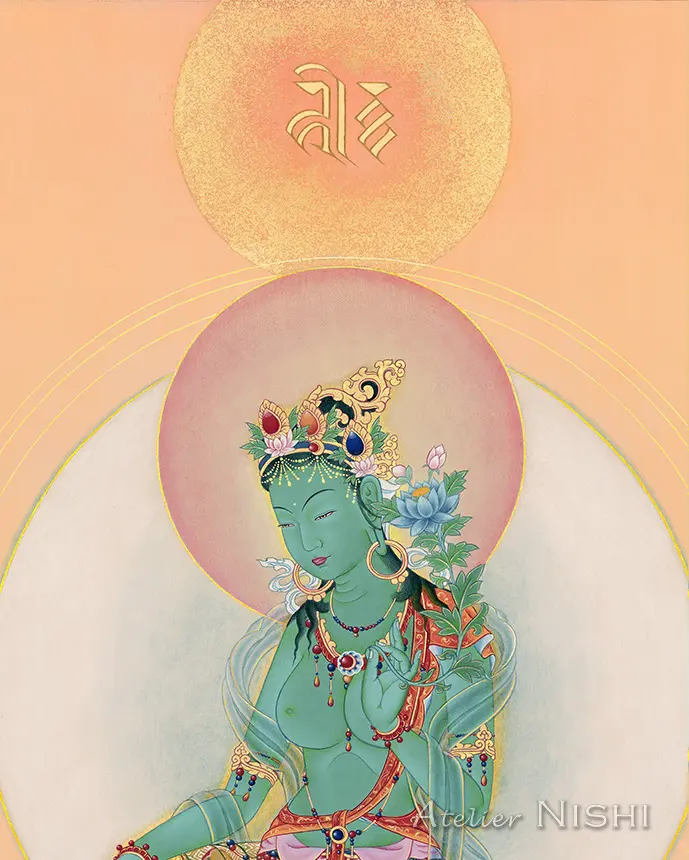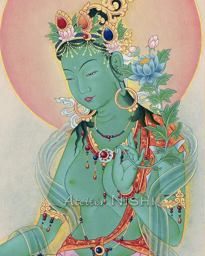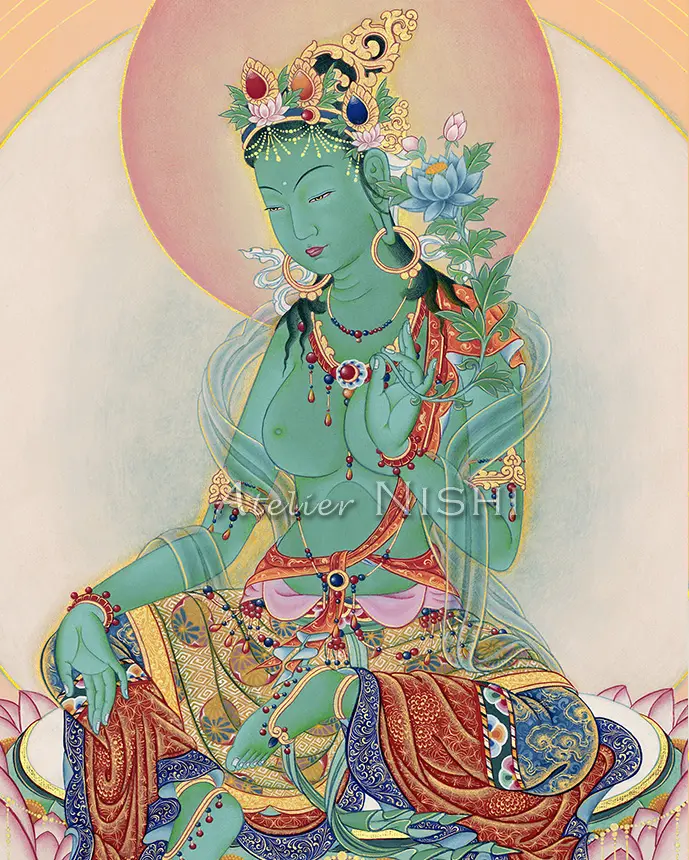 この作品は、衆生を慈しみ、速やかに守護を施すことで広く尊崇される女尊・緑ターラーの静謐かつ荘厳な存在感を現した高品質複製画です。