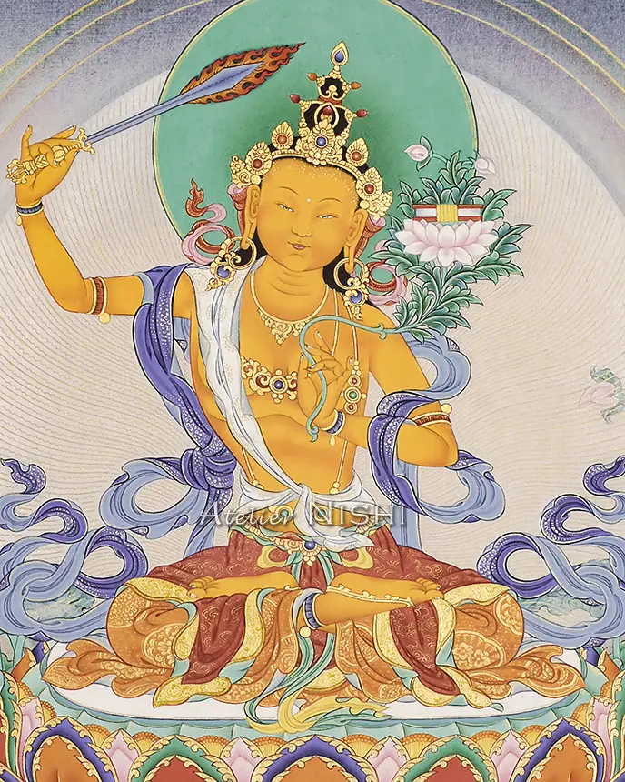 文殊菩薩(マンジュシュリ)は智慧を象徴する尊格で、煩悩を断ち切り、真理を見極める力を授けるとされています。本作品は、その文殊菩薩を描いたタンカを、100%コットン製アート紙にプリントしたアーカイブクオリティの複製画です。