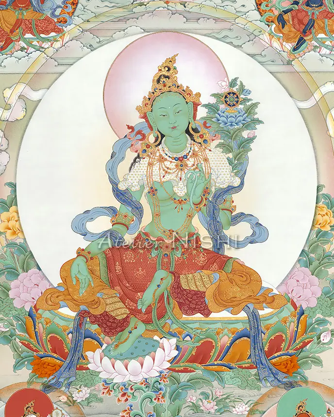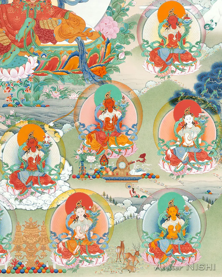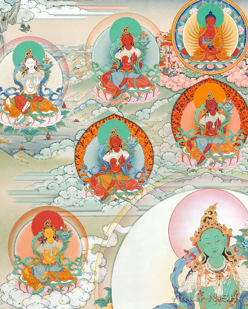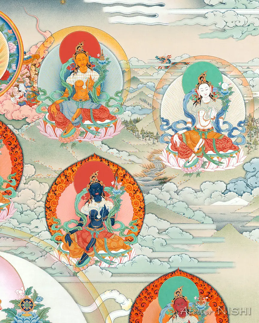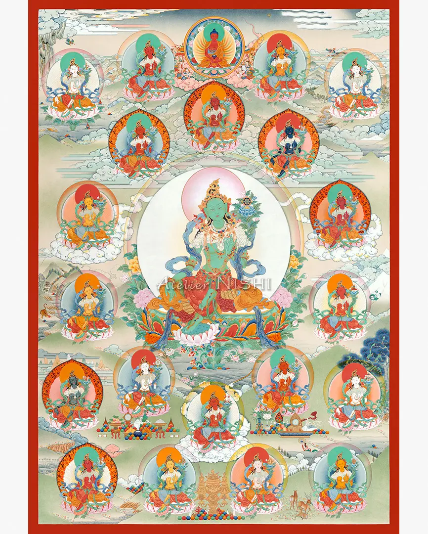中央には、法輪を戴く蓮華を持つ主尊・緑ターラーが座し、画面最上部には虹に包まれた阿弥陀仏が描かれています。本尊の周囲には悟りの活動と慈悲の守護を体現する寂静、忿怒、半忿怒の二十一尊のターラーが二重の円を描くように配置され、表情や体色、持物がそれぞれ異なる姿が、神聖な供物や神話的な生き物とともに静謐な風景の中に描かれています。