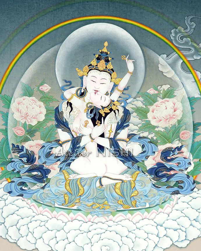 本作品は、両手を胸前で交差させて明妃を抱くという珍しい姿の金剛薩埵(ヴァジュラサットヴァ)父母尊を描いたタンカを、100%コットン製アート紙にプリントしたアーカイブクオリティの複製画です。
