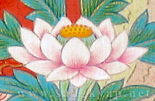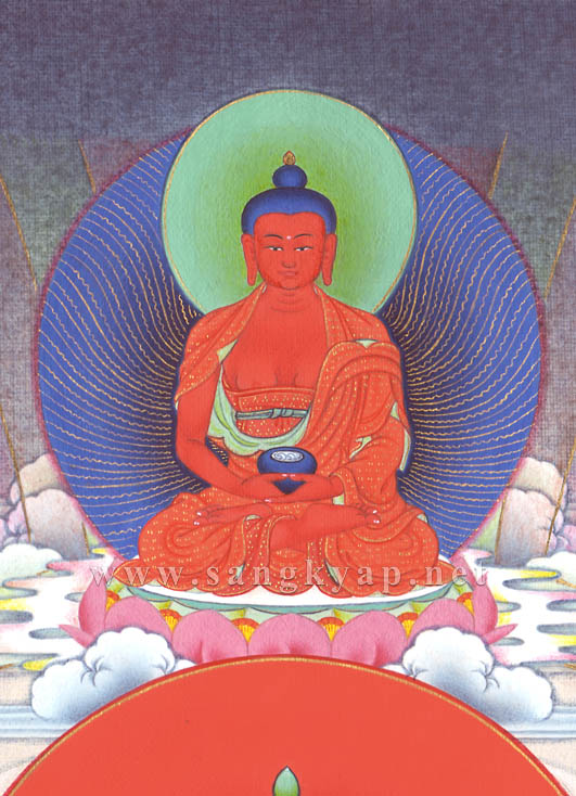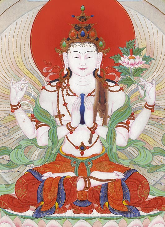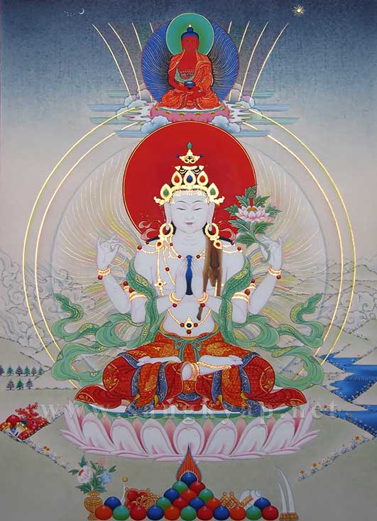 チベットで最も広く信仰される尊格、四手の観音菩薩と、五仏のうち蓮華部の主尊阿弥陀如来を描いたタンカです。 ”五つの色を含む白く澄んだ光を放ち、白い蓮華と月輪の上に座す観音菩薩。静かな微笑みを浮かべ衆生を見守る瞳は大慈悲に溢れる、、、” 透き通る白い光背は、純金泥による細く波打った線と白・青・黄・赤・緑の五色の光で儀軌の記載に沿うように描かれています。白く輝く身体は、立体感を出しながらも白さを失わないように極淡い色で暈され、衣には観音菩薩の属する蓮華部に因んだ蓮等の花の文様が純金泥で細密に描かれ、装身具部分など磨かれた純金泥の輝きがタンカに荘厳さを加えています。
