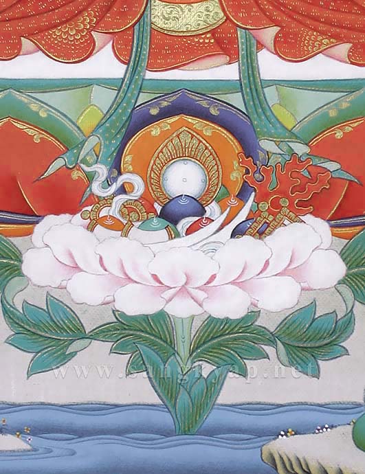 尊格の後ろの光背が、弧の周辺のみを白色で描いた中に純金泥で波線を描き込むというカルマ・ガディ派で良く見られる透明感のあるスタイルで描かれてあり、サイズの小さいタンカであるものの、背景を光背で隠してしまわないことで広がりのある画面になっています。
