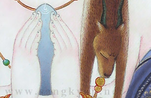 宝珠を持ち胸前で合掌するように合わせた両手と、左肩の鹿(アンテロープ)の皮。