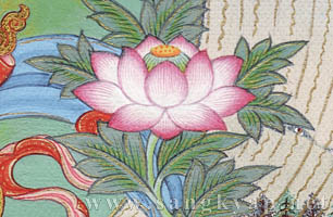 また、このタンカの例のようなチベットで良く見られる極彩色の蓮台に使われる、青、緑、赤、燈の各色は、一色ごとの彩度はそれほど高くなく落ち着いた色調ですが、青と燈、緑と赤という補色関係にある二色を組み合わせることで、蓮台をより鮮やかに見せています。
