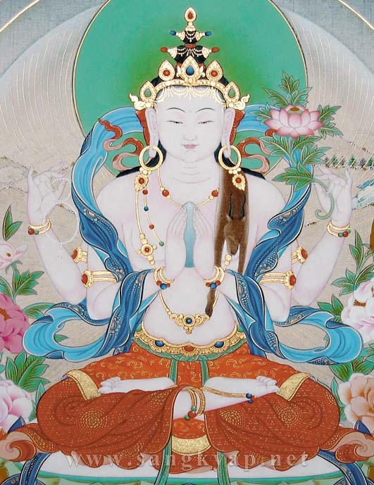 チベットで最も広く信仰される尊格、四手の観音菩薩を花々に囲まれる姿で描いたA4サイズの小さいサイズのタンカです。
