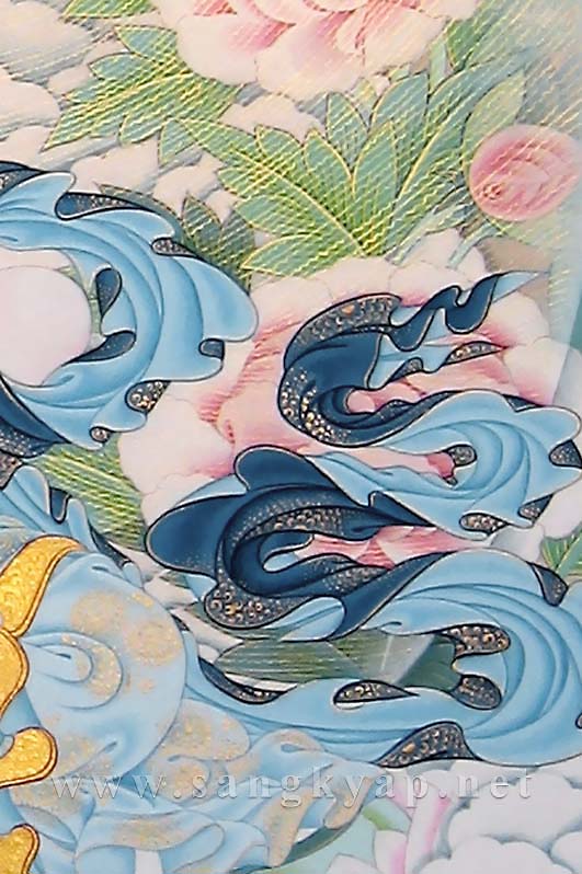 ”浄化”の尊格・金剛薩捶の瞑想修行において、その姿が”陽の光に反射して輝く雪山”や”水晶”に例えられることがあります。そのことから、通常のタンカの制作ではいくつかの異なる色をバランスよく使い彩色される衣や装身具などの部分が、本タンカでは赤やオレンジといった暖色が使用されず、身体は白く、その他のほとんどの部分は色味の異なる青・緑といった寒色と純金泥で彩色されています。