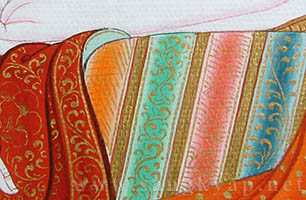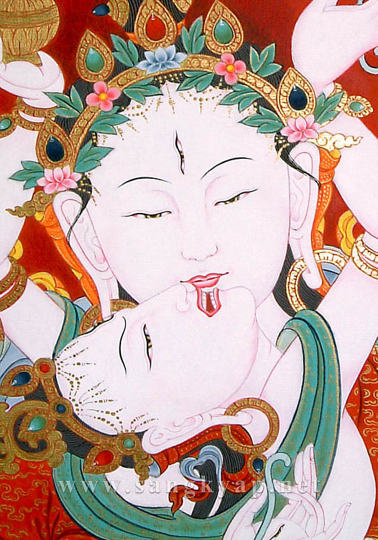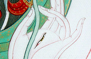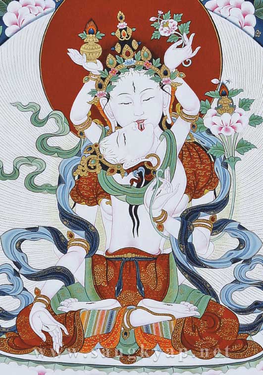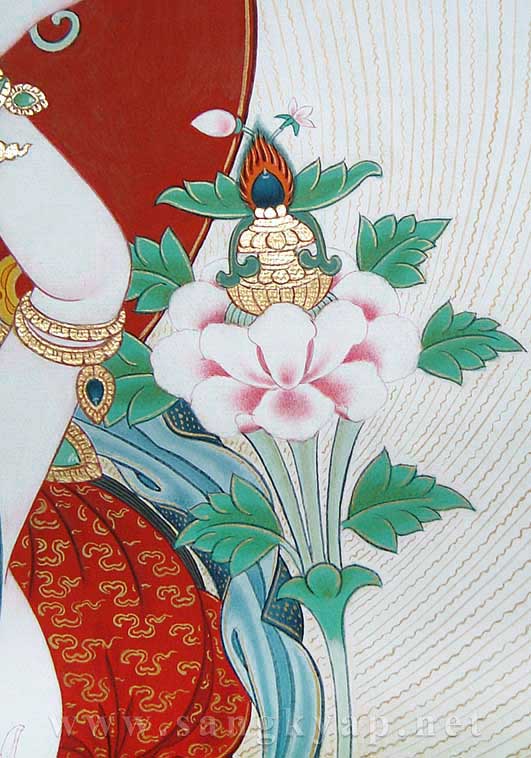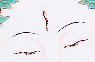 The stainless bright face of White Tara with very light skin shading. The "third eye" or "Eye of Wisdom" on her forehead.