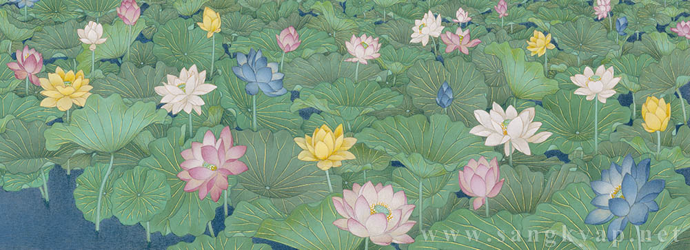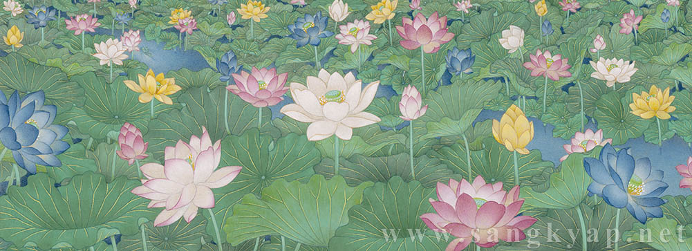 Lower half of the painting is filled with countless colorful lotuses and