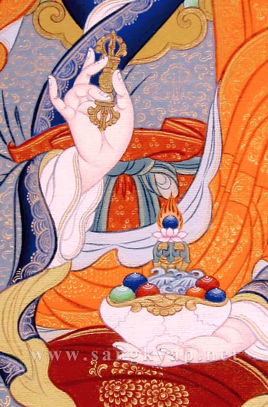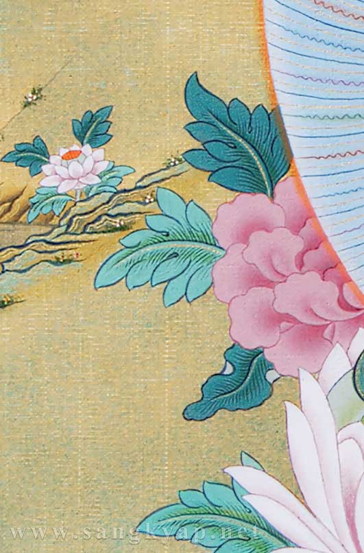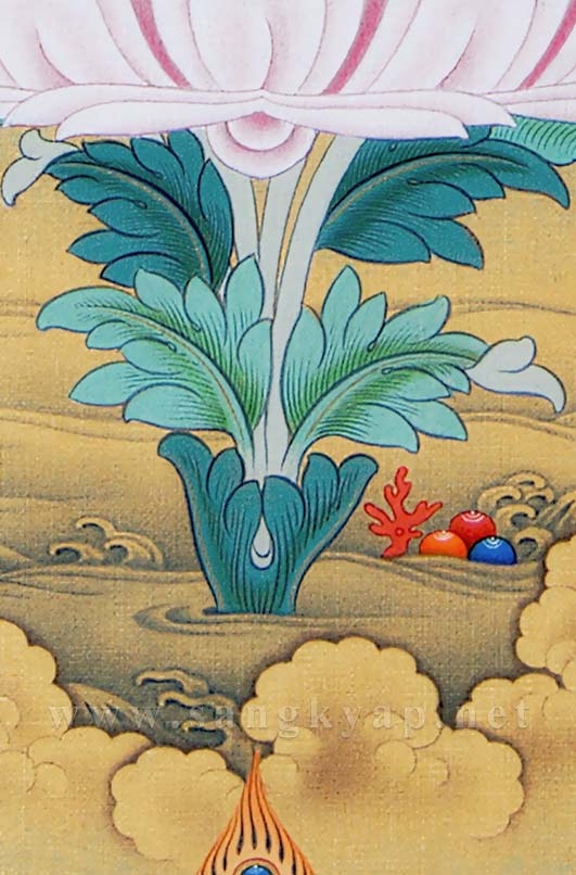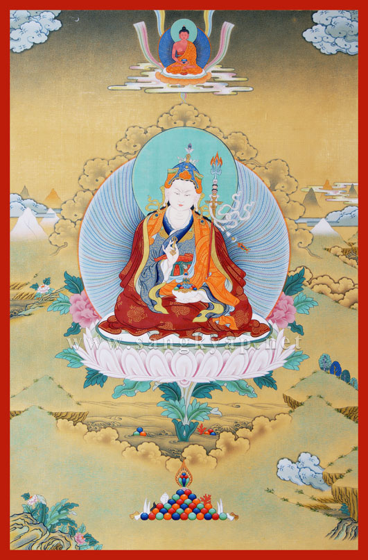 Above Padmasambhava is the head of the Lotus Family Amitabha Buddha floating in the sky with multicolored clouds and rainbow rays.