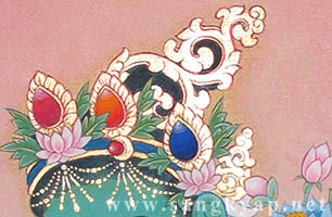 above which shows the infinite light of the Buddha Amitabha whose body is red in color. Above her head halo, in a circle of small