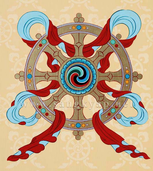 The Wheel of Dharma decorated with gold and silver color with a blue, green and red colored "Ga-kyil" at the center.