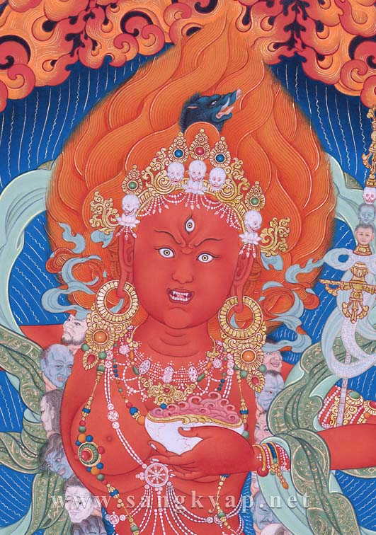 Wrathful offering of the five meats and five nectars in a skull cup.
