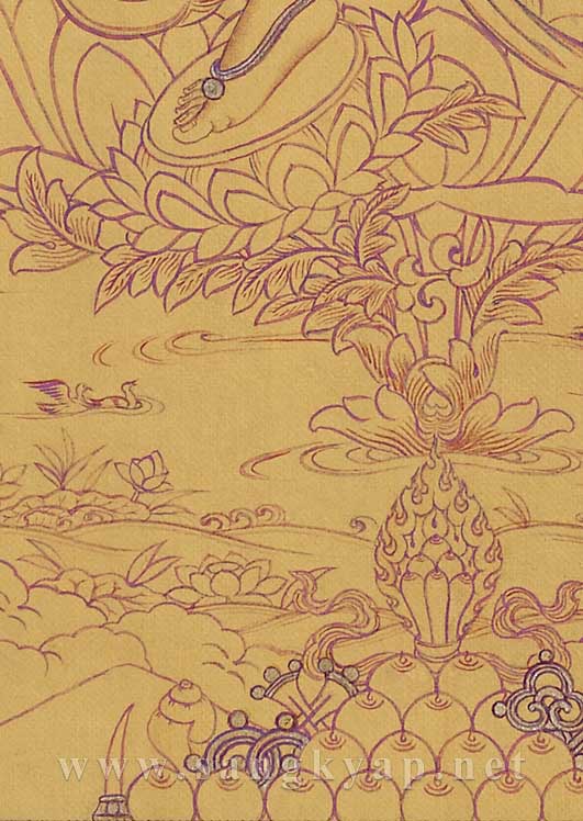 装身具や光背の外側の弧、そして供物の一部といった純金泥で彩色された部分が磨かれ輝いているため、背景が純金泥の色に近い黄土色でも平たい印象が感じられず、逆に極少ない色数で描かれたタンカの良さが出ています。