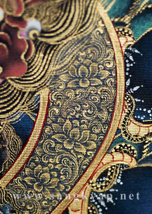 大きく開いた右側の翼はドルジェ(金剛杵)の翼。その先端にドルジェを描くことで表現されている。