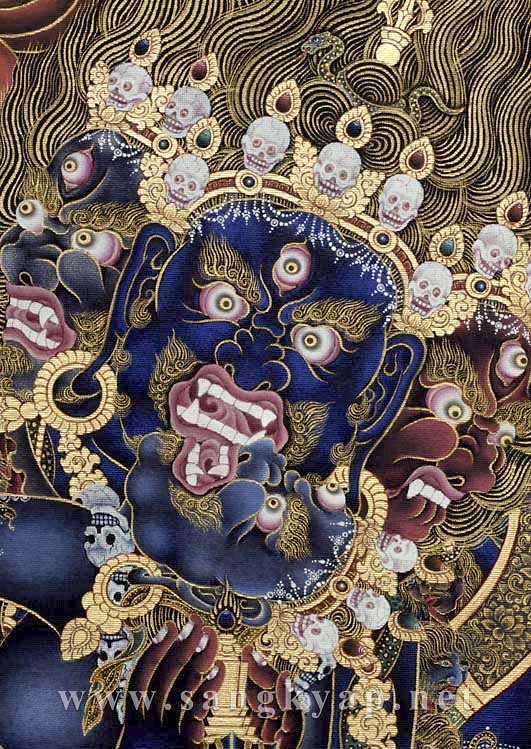 明妃コルロ・ギェーデプ・マの身に着ける頭蓋骨の首飾りと、主尊ドルジェ・プルパが身に着ける生首の首飾り。